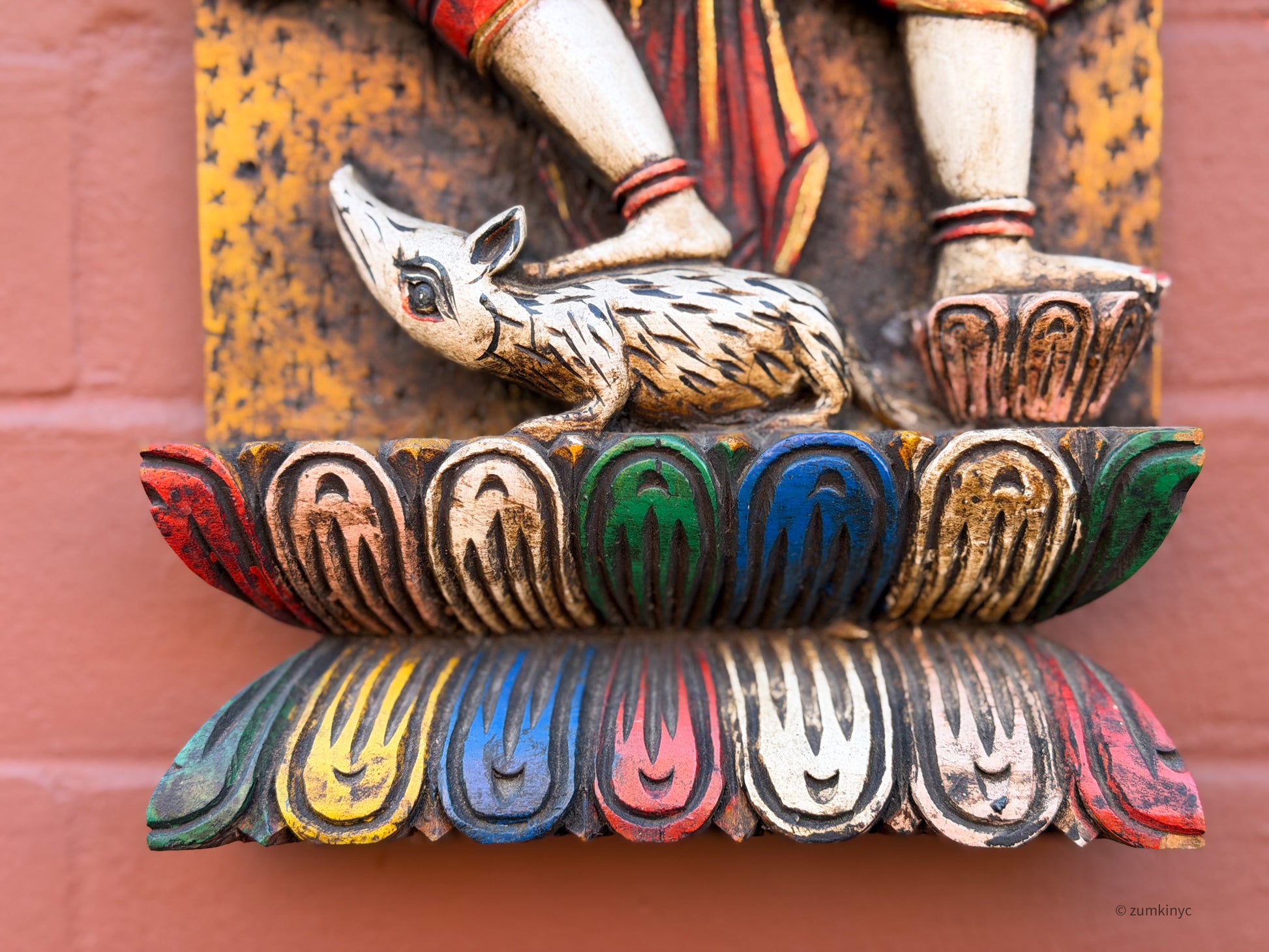 Each carving is made entirely by hand using age-old Himalayan wood-carving techniques. The reclaimed wood and plant-based pigments give the sculpture a natural, weathered beauty that makes every piece one-of-a-kind. Perfect for hanging in a meditation space, entryway, or sacred altar, it brings blessings of success and protection into any environment.