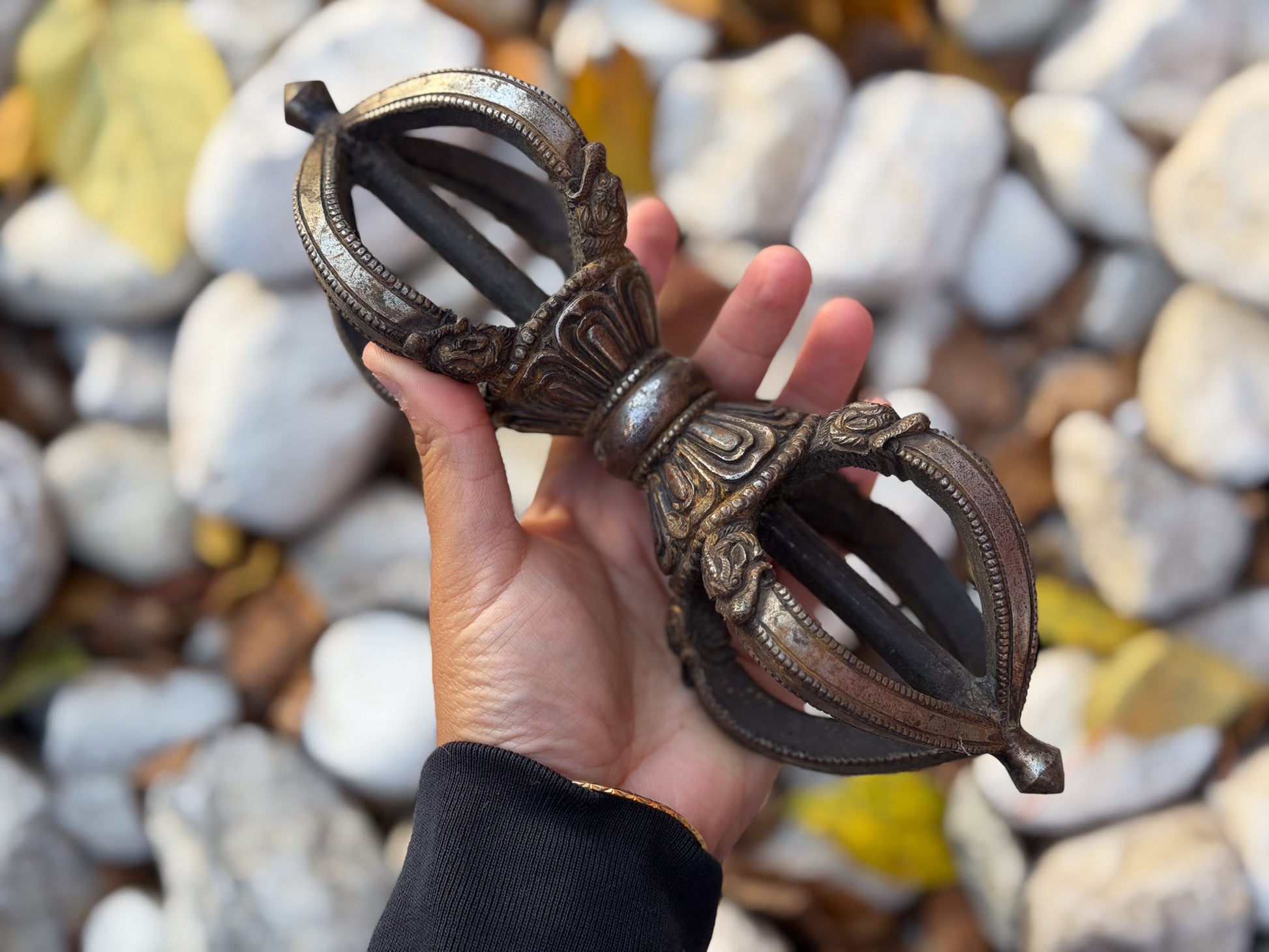 This one-of-a-kind Vajra, also known as a Dorje, is handcrafted in Nepal from solid iron — symbolizing strength, clarity, and the indestructible nature of truth. In Tibetan Buddhism, the Vajra represents the thunderbolt of enlightenment, cutting through ignorance to reveal wisdom and compassion.