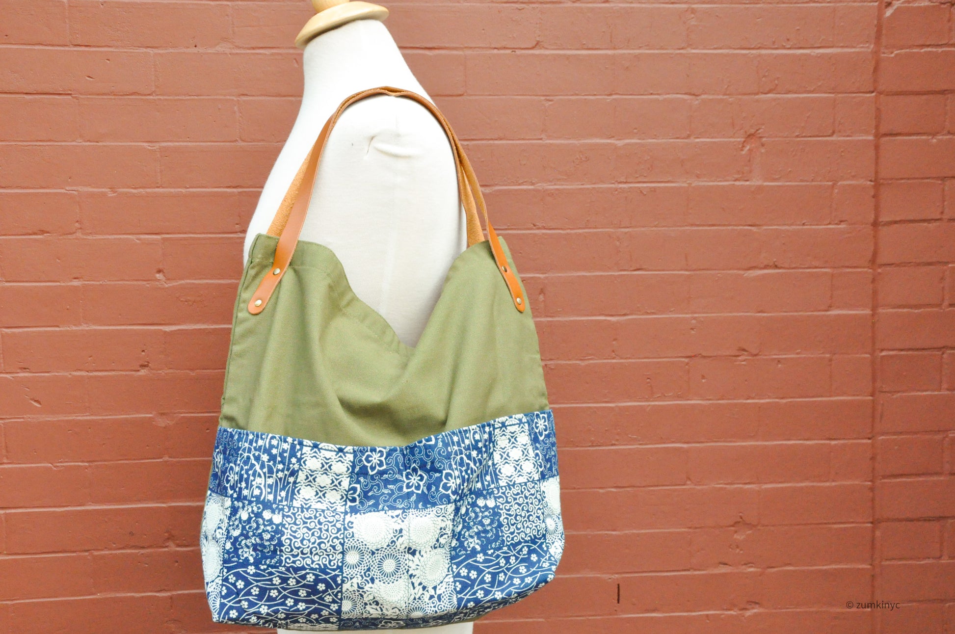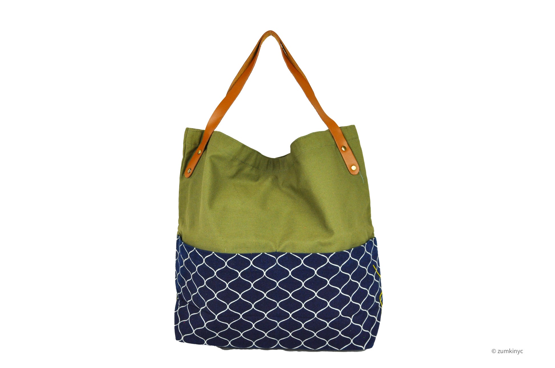 This everyday tote is handcrafted in small batches under fair trade conditions in Thailand using sustainable materials. The body is made of sturdy cotton and features an assorted indigo patchwork design—each one uniquely patterned—paired with a mustard cotton top and finished with soft vegan leather shoulder straps. Lightweight yet roomy, it's perfect for daily errands, work essentials, or market strolls.