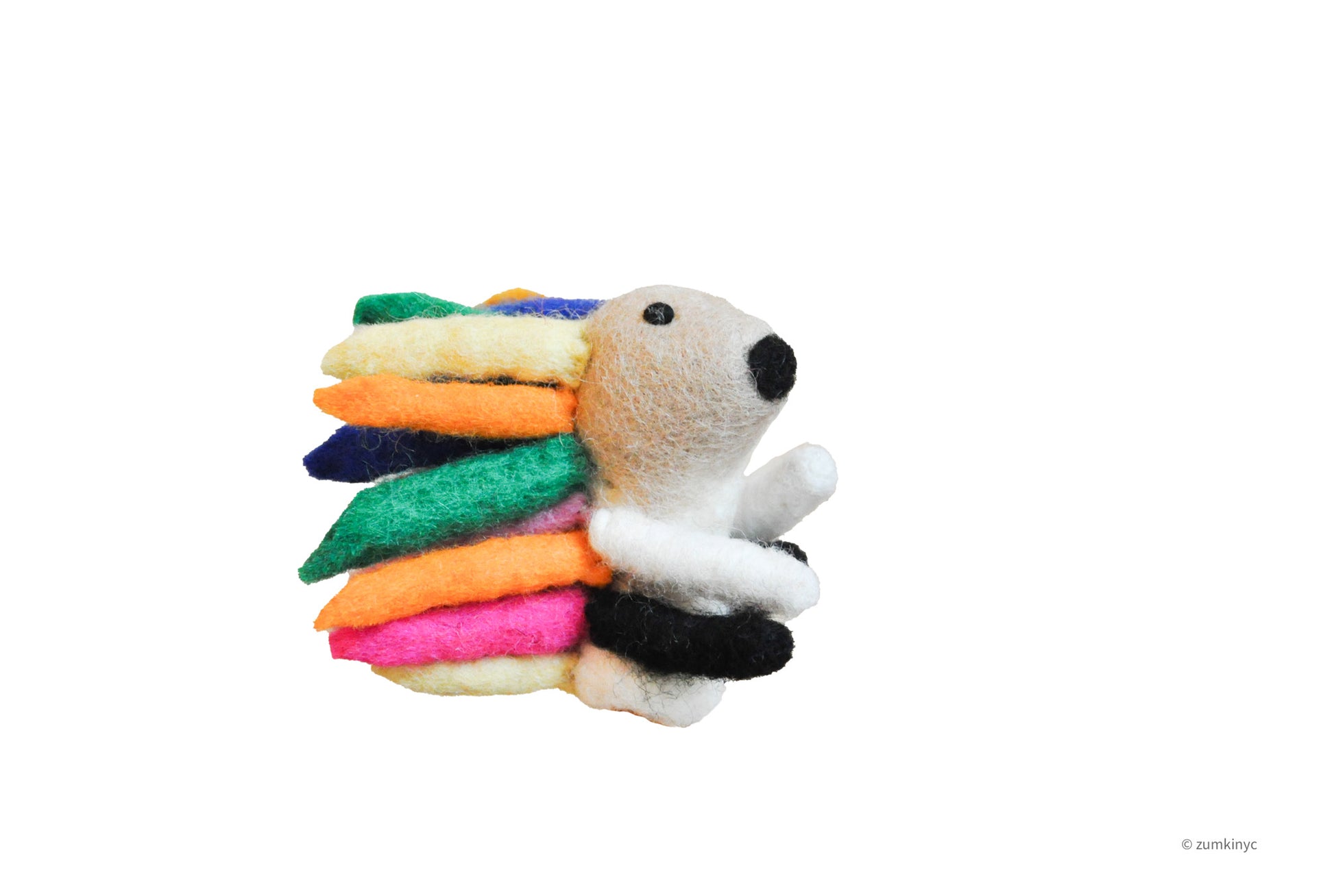 Bright, spiky, and full of personality—this rainbow hedgehog is ready to steal the show! Handcrafted in Nepal from 100% sheep wool, this playful puppet features a soft white body and a vibrant rainbow of felt “spines” along its back.